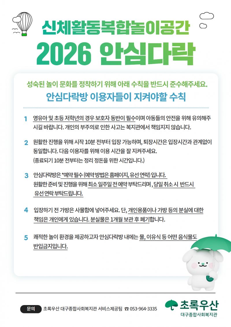 | 이용장소 | 대구종합사회복지관 3층 신체활동 복합놀이공간 '안심다락' |